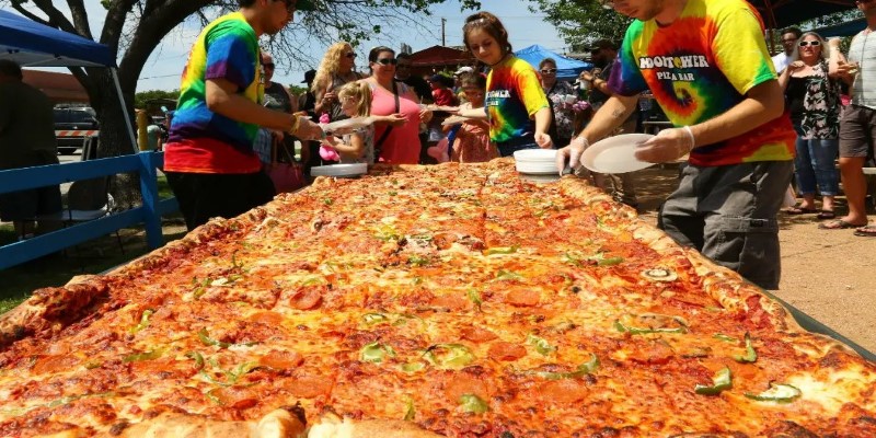 2017 年、テキサス州フォートワースでは、毎年恒例のピザ フェスティバルで巨大なピザが作られました。46.64 平方メートル (502 平方フィート) のこのピザには、数百キログラムの生地、チーズ、トッピングが必要でした。複数のピザ屋とボランティアが協力してこの巨大なピザを作成し、フェスティバルのハイライトとなり、地元のピザ文化の証となりました。