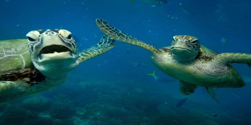 画像の鮮明さ、海の鮮やかな青、カメの自然な表情が組み合わさって、この写真は楽しく忘れられない視覚体験となっています。これは、自然が自発的で、まるで演出されたかのような瞬間で私たちを驚かせることができることの完璧な例です。
