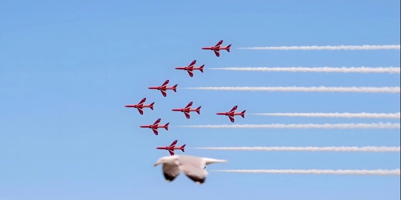 この画像は、動物界に見られる集合知と優雅さを美しく表現しており、鳥の飛行の滑らかさと正確さに見る人を魅了します。