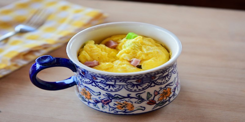 時間がないときには、マグカップでオムレツを作りましょう!耐熱性のマグカップに卵2個と好きな具材を混ぜ、電子レンジで1〜2分加熱します。